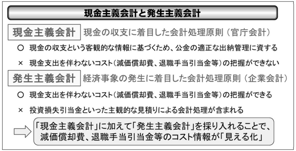 なので、従来の現金主義による歳入・歳出予算・決算が主で、発生主義による財務書類がそれを「補完」する、という位置づけにしているんですね。