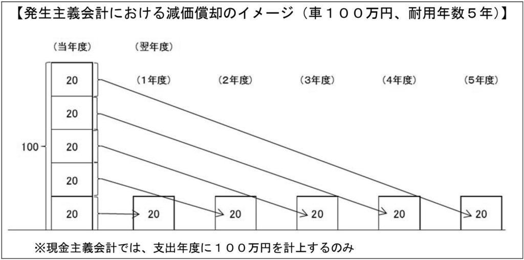 資料にも書かれているとおり、現金主義会計では、100万円の車両を購入し代金を支出した年度に「備品購入費100万円の歳出」が記録され、その後の年度は、この車両をどれだけ乗り回しても、ガソリン代や車検等を除いて、車両本体に関する費用は記録されません。